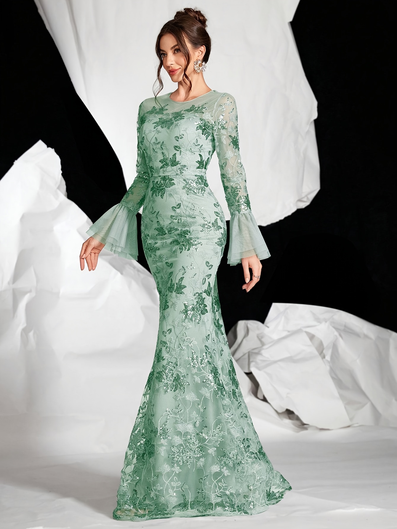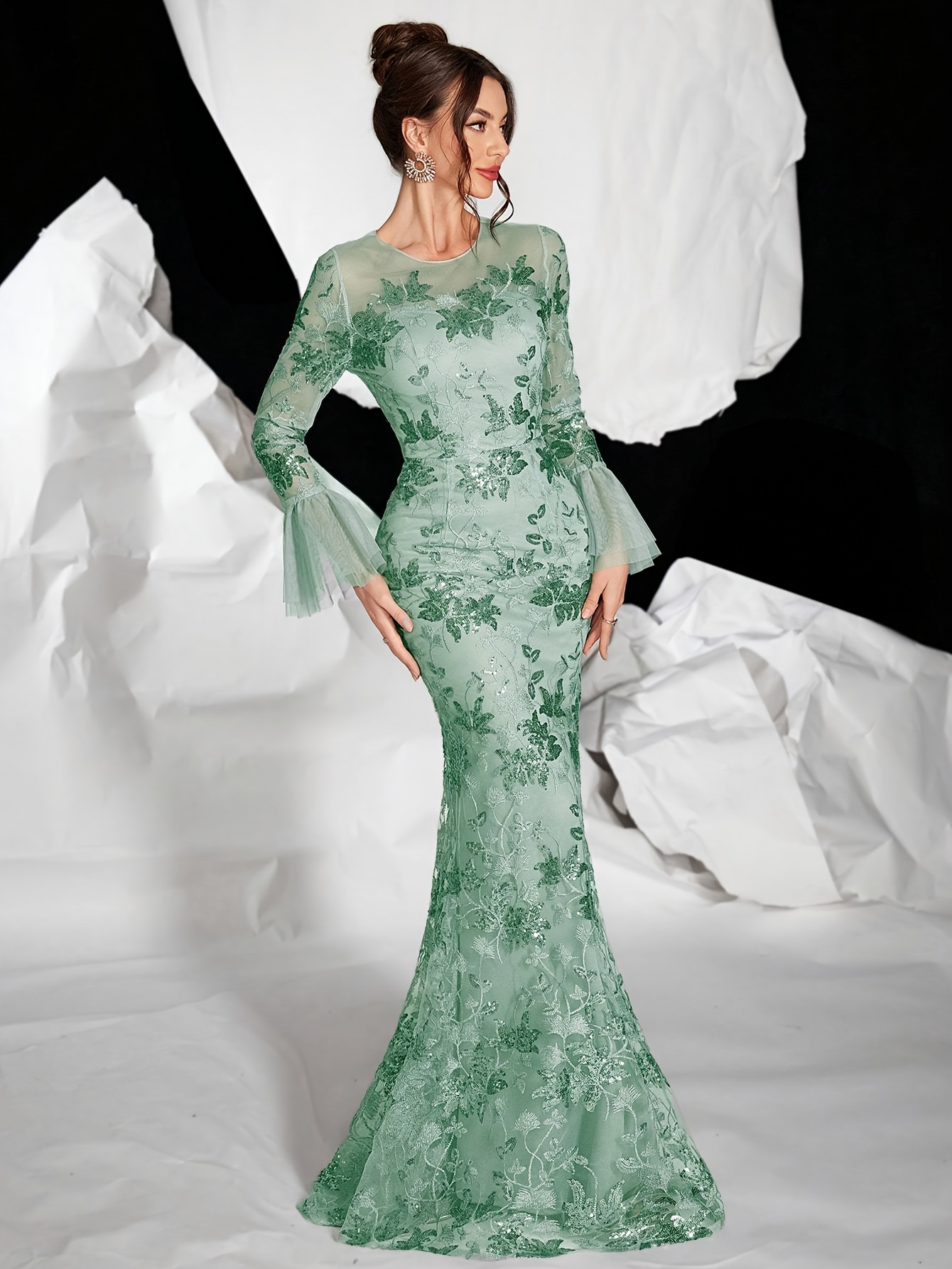 Elegant Mint Green Floral Evening Gown for Women - Long Sleeve, A-Line Mermaid Dress with Sheer Overlay, Perfect for Weddings and Formal Events, Formal Evening Gown