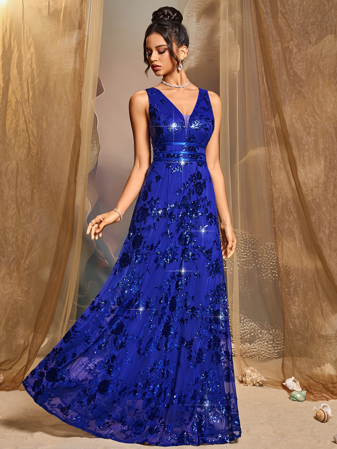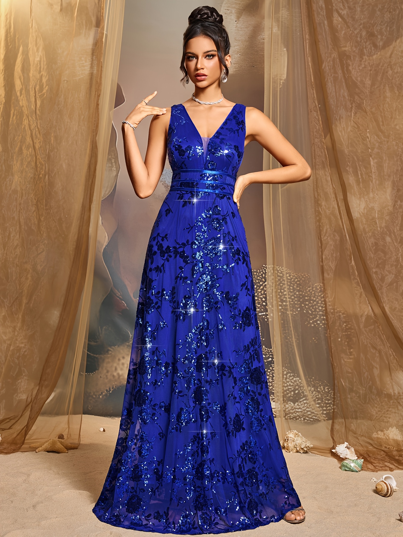 Elegant Royal Blue Sequin Gown for Women - V-Neck, Waist-Cinching Long Dress with Flowing Skirt, Perfect for Parties, Galas, and Formal Events, Formal Event Attire|Sequin Embellished Dress|Sleek Fitted Top