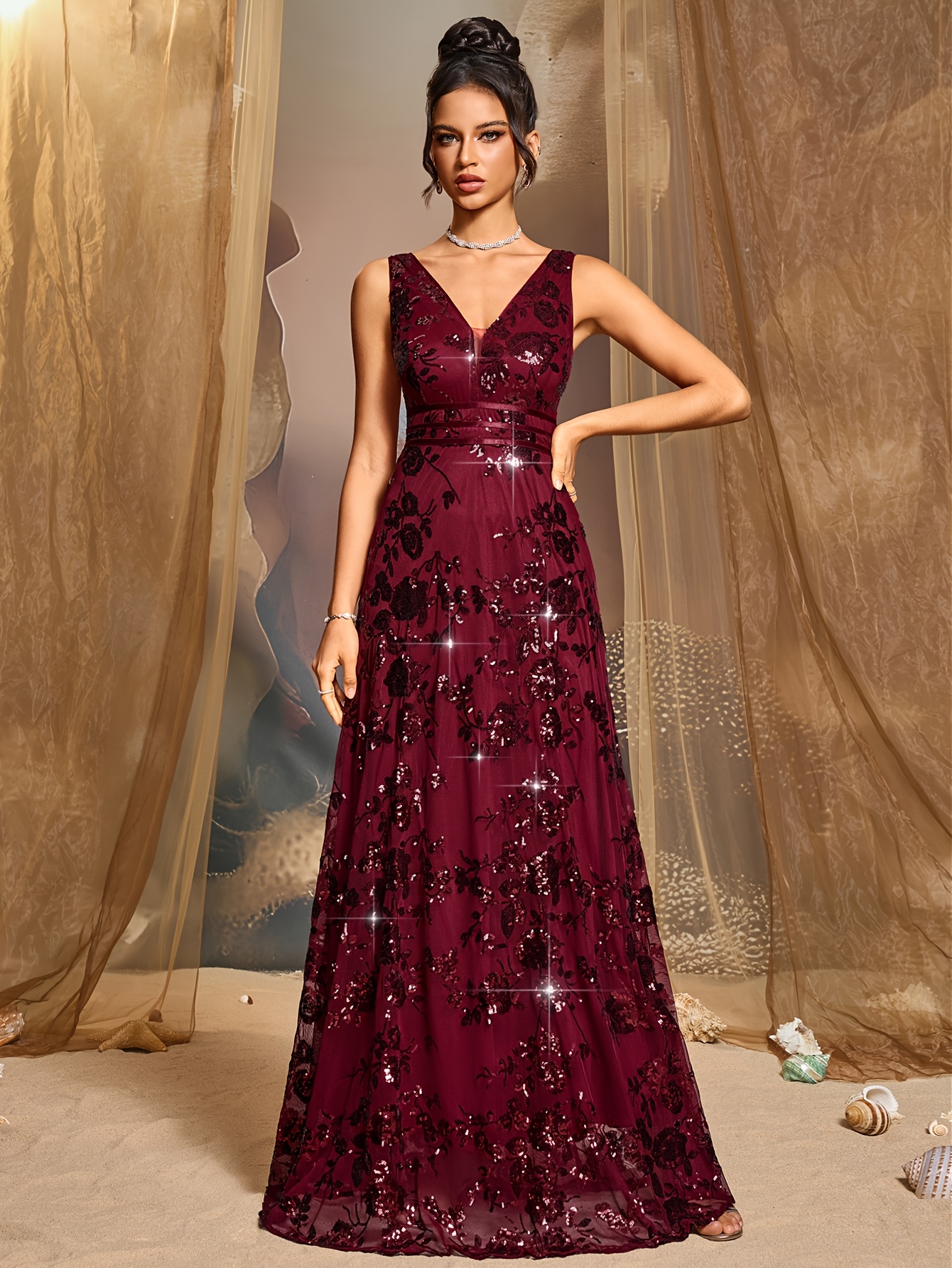 Elegant Wine Red Sequin V-Neck Gown for Women - Waist, Long Evening Dress for Parties, Banquets, and Formal Events, Perfect for Graduations and Cocktail Parties, Elegant Event Attire | Vneck Design | Shimmering Sequins