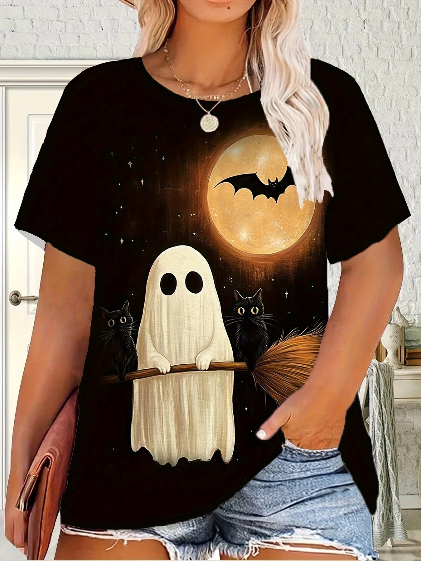 [Halloween Shirts] Plus Size Women's Halloween T-Shirt - Spooky Ghost, Bats & Full Moon Print, Stretchy Round Neck Short Sleeve Top | Casual Summer Outdoor Wear, Elegant & Comfortable Fabric