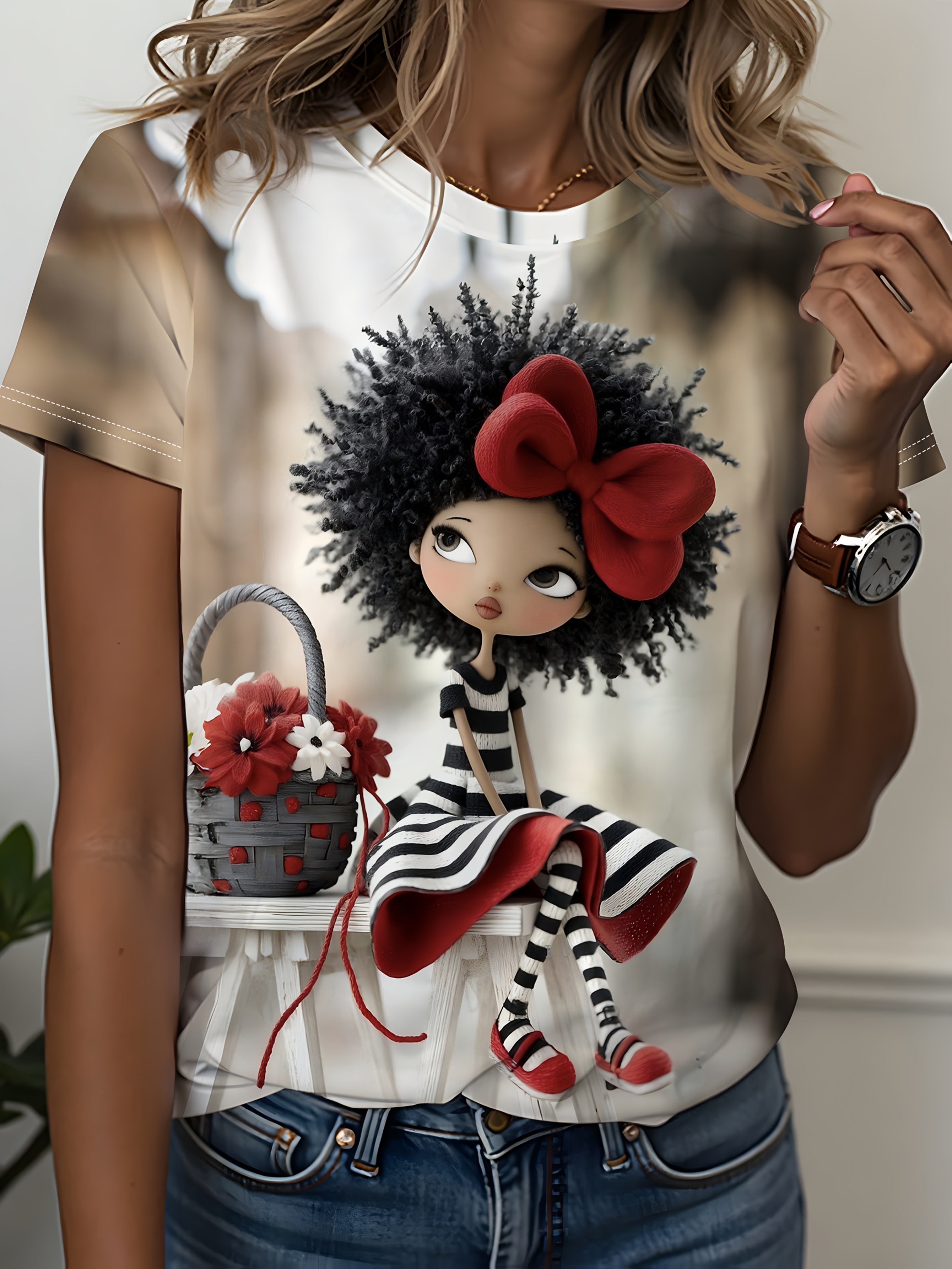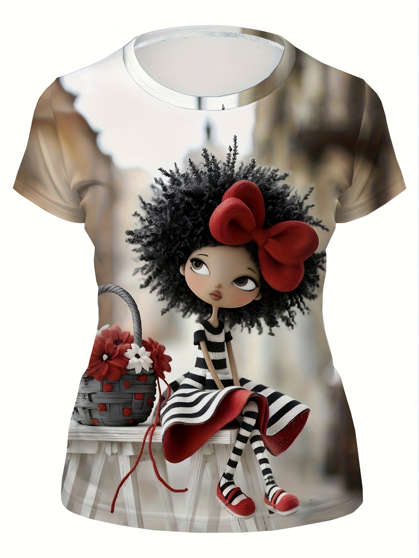 Women'S Casual T-Shirt with Vibrant Comic Art Print - Soft, Comfortable Round Neck Tee with Red Bow & Floral Basket Design, Perfect Gift for Casual Attire, Ladies T Shirts