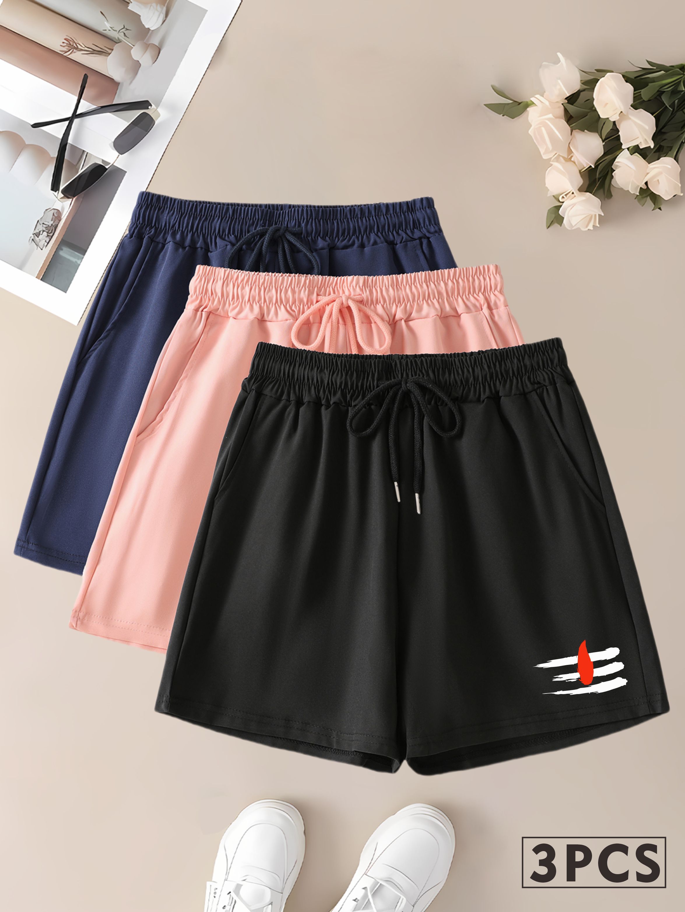 Women's Summer Shorts 3pcs | Quick-Dry Polyester | Elastic Waistband with Drawstring | Geometric Print | Multi-Color Casual & Beach Wear | Lightweight, Non-Stretch Fabric | All-Season Comfort Fit