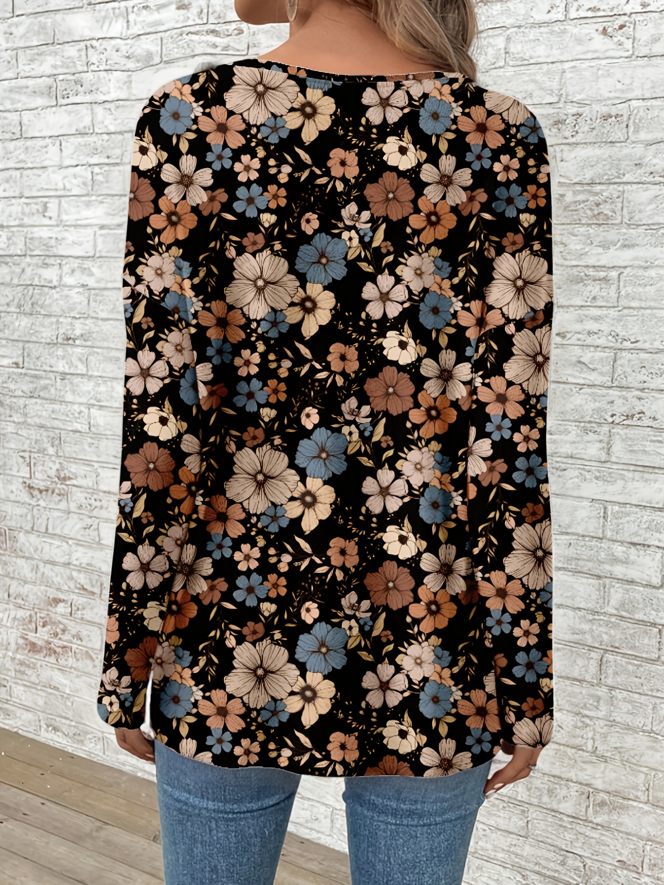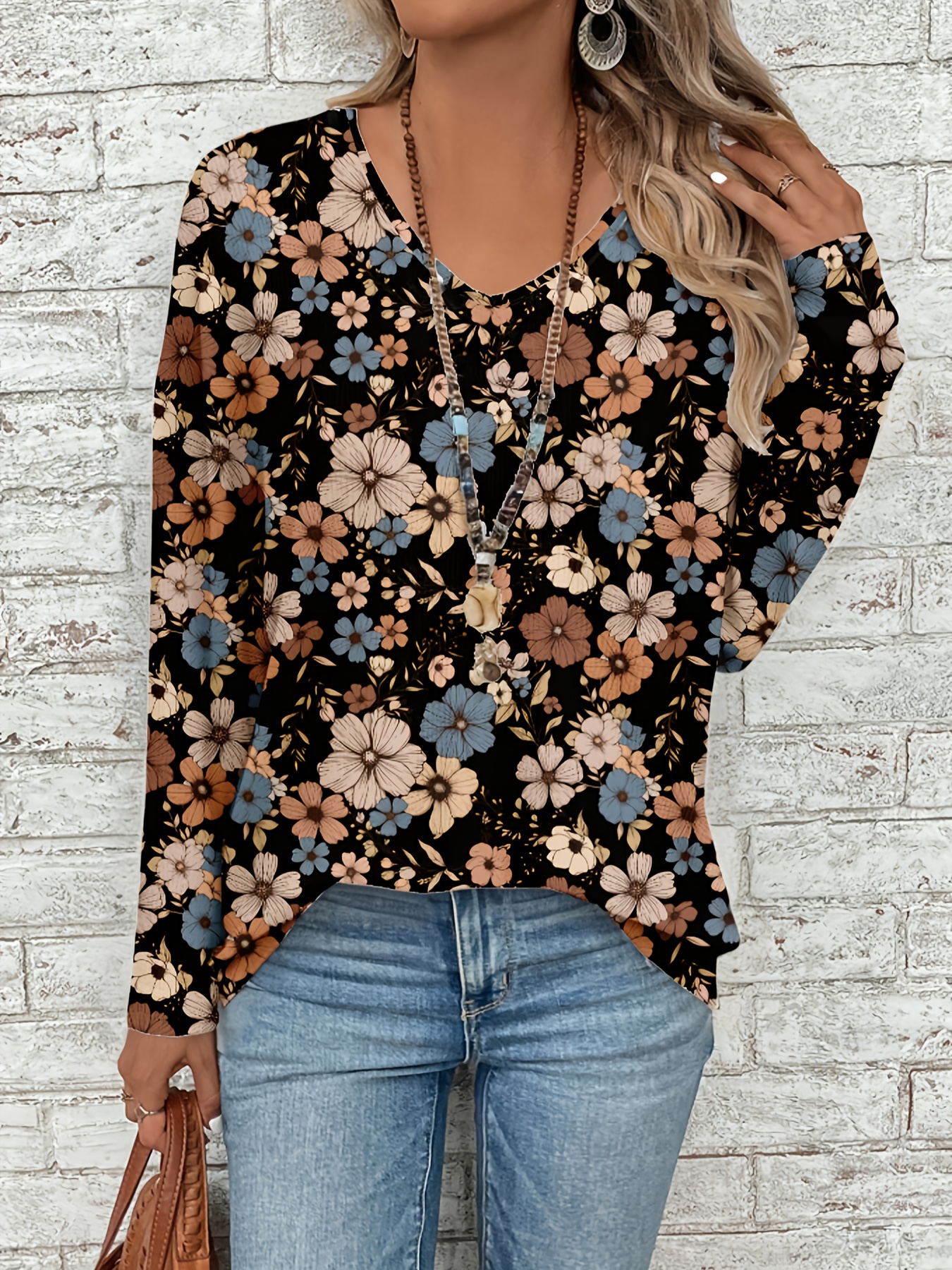 Plus Size, Plus Size Women's Elegant V-Neck Long Sleeve Blouse - Brown/Beige/Taupe Floral Print Tunic Top, Wrinkle-Resistant & Machine Washable, Loose Fit for Jeans or Dresses (Casual to Formal) - Spring Summer Fall Wardrobe Staple