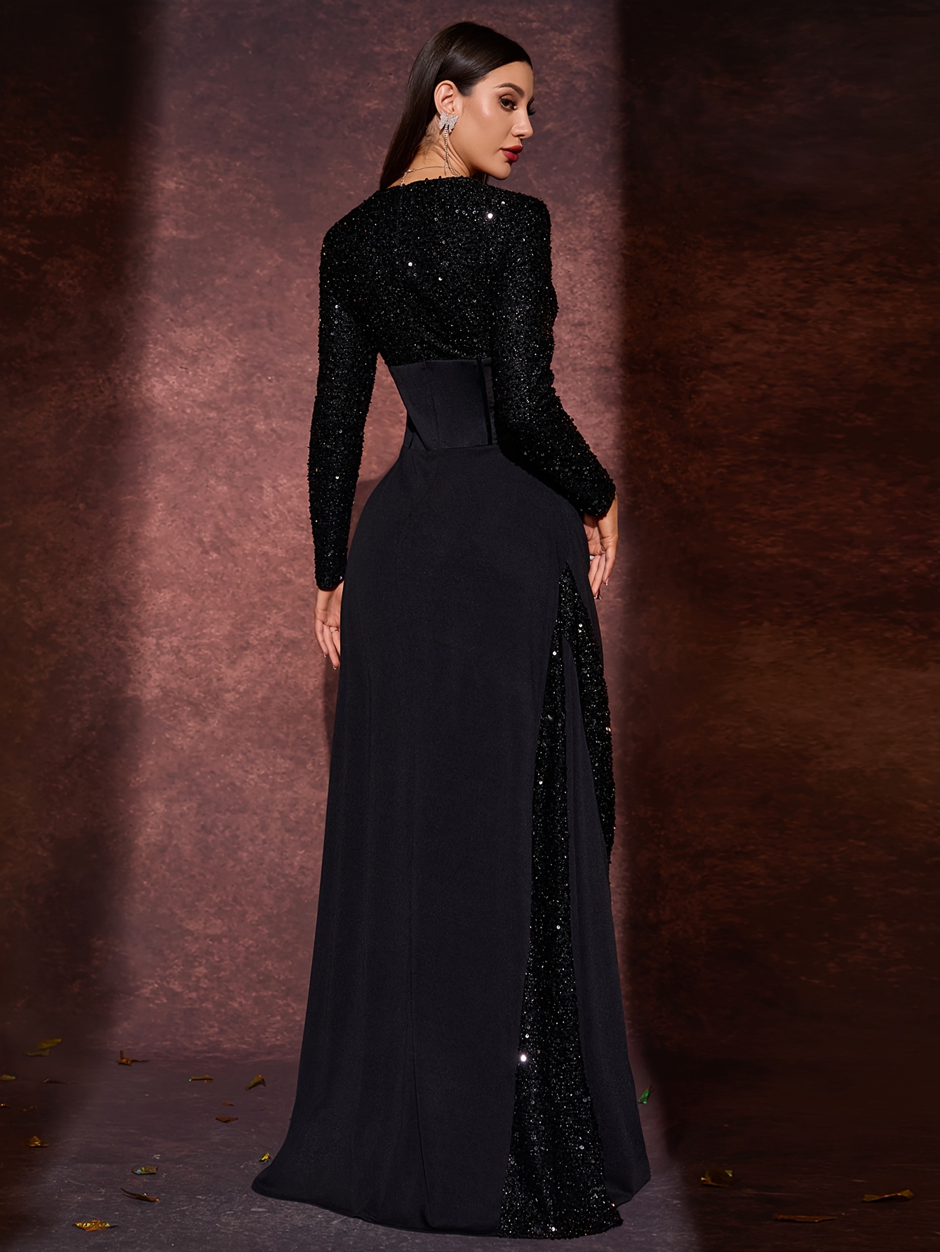 [Sequin Formal Dress] Elegant Sequin V-Neck Long Sleeve A-Line Dress | Women's Floor-Length Formal Party Gala Evening Gown with Waist-Cinching & High Slit