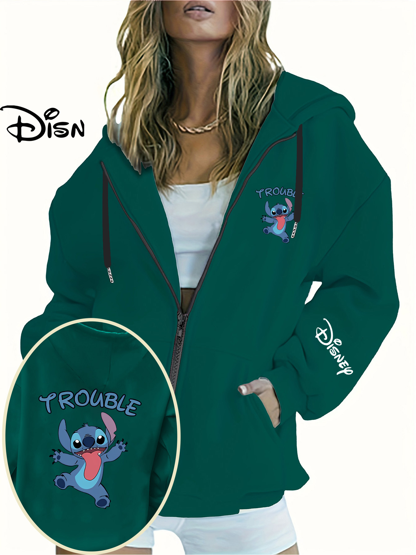 Disney Stitch TROUBLE Women'S Casual Zip-Up Hoodie - Front Zipper Design, Pink Cartoon Print, Cozy Fall/Winter Jacket with Hood, Cute Hoodies