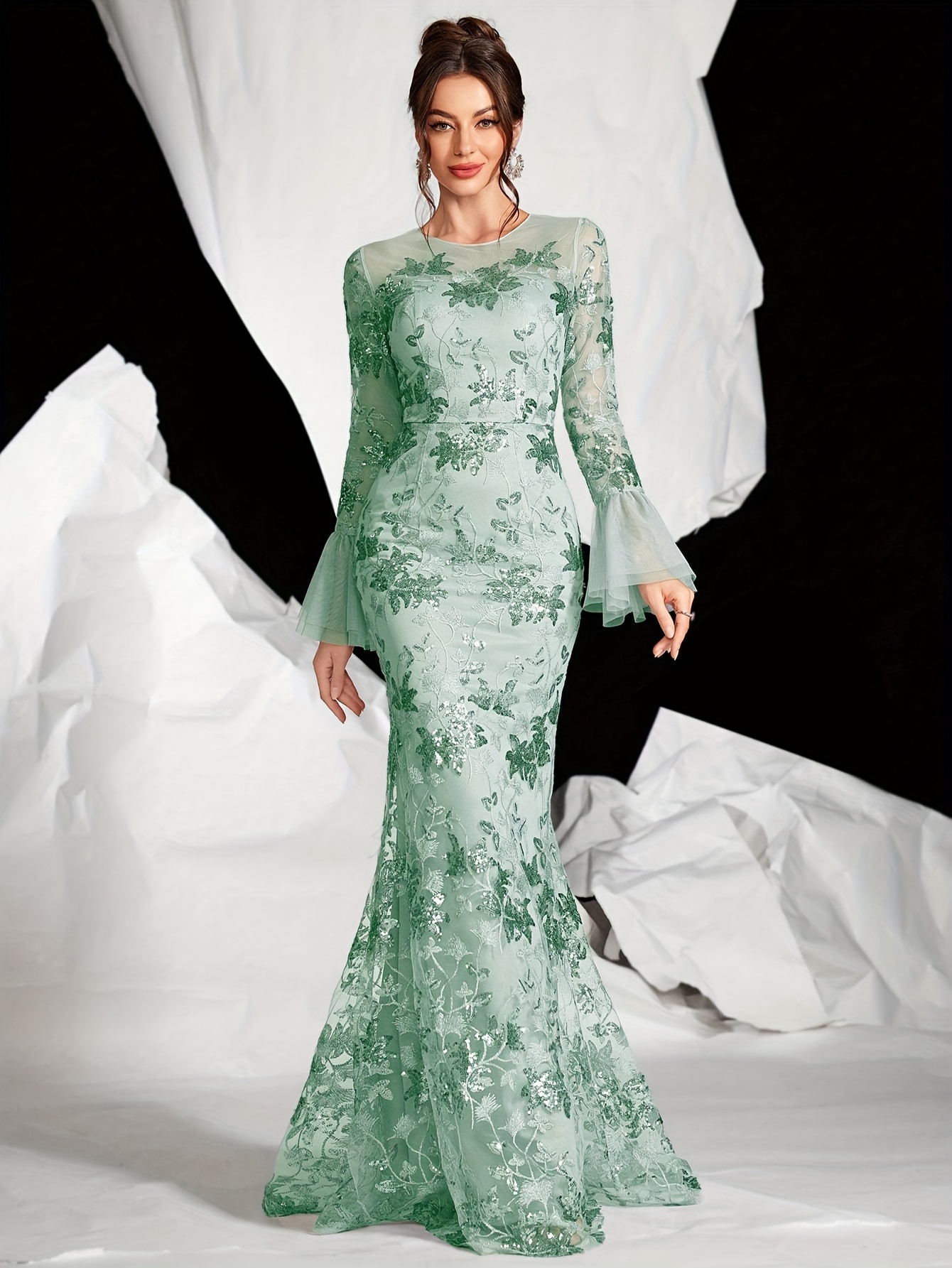 Elegant Mint Green Floral Evening Gown for Women - Long Sleeve, A-Line Mermaid Dress with Sheer Overlay, Perfect for Weddings and Formal Events, Formal Evening Gown
