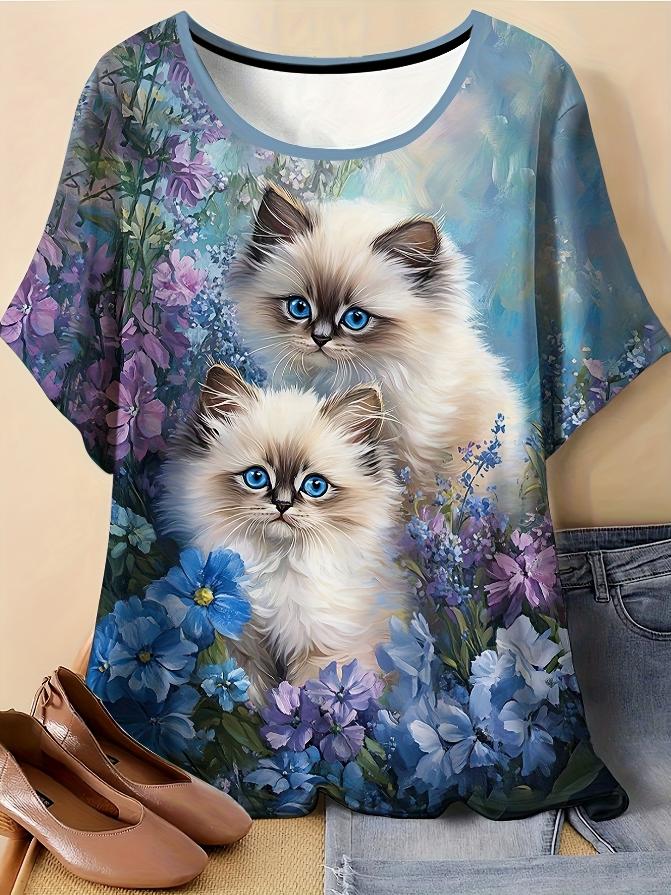 [Plus Size Floral Cat T-Shirt] Plus Size Women's 3D Floral & Cat Print T-Shirt - Stretchy Round Neck Short Sleeve Summer Top, Machine Washable Casual Elegant Outdoor Wear